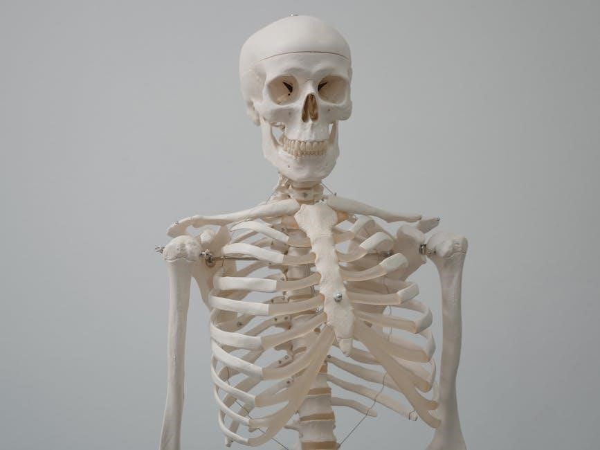 Manuals often include detailed illustrations and labeling exercises. Understanding bone classifications – long, short, flat, irregular – is crucial. Practical application involves recognizing bones in radiographs and relating anatomical features to clinical scenarios.